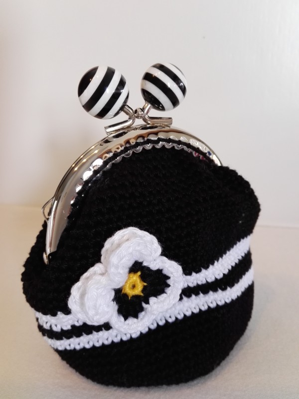 Turquoise gehaakte portemonnee met oranje bloemetjes..