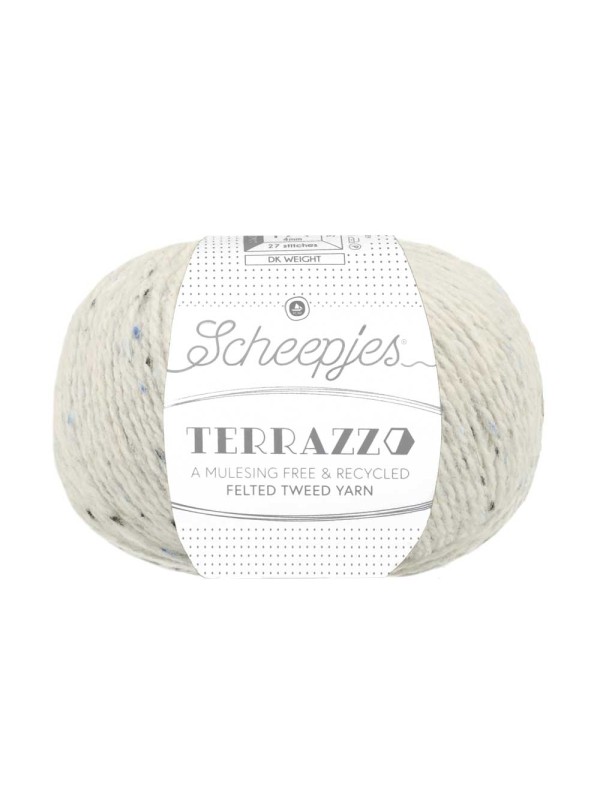 Scheepjes Terrazzo is een volledig gerecyclede wol-viscosemix met een luxe uitstraling en een subtiel gespikkeld kleureffect, dat doet denken aan terrazzo (granito) vloeren. Het gespikkelde effect wordt bewerkstelligd door de vezelpropjes in contrasterende en complementerende kleuren die in deze tweedwol zijn mee getwijnd. Scheepjes Terrazzo profiteert van de ademende kwaliteiten van zowel wol als viscose en combineert daarnaast het beste van die twee: dankzij de viscose voelt het garen zijdezacht aan, is het vocht absorberend, valt het mooi, heeft het een rustieke uitstraling en is het licht van gewicht, terwijl de wol het heerlijk warm maakt. Die combinatie maakt Terrazzo geschikt voor de meest uiteenlopende haak- en breiwerken: van kleding, zoals truien en vesten, tot mode- en woonaccessoires in allerlei vormen en maten. Het leent zich ook prima voor inbreiwerk en haken met meerdere kleuren en is bovendien heel mooi te combineren met Scheepjesgarens in andere texturen, zoals Alpaca Rhythm en Mohair Rhythm. Scheepjes Terrazzo is een Premium Blend tweedwol gemaakt van 70% gerecyclede wol en 30% gerecyclede viscose en is wasbaar tot 30 ᵒC. De geadviseerde naalddikte is 4.00mm (stekenverhouding: 27 steken x 35 naalden tricotsteek is 10 x 10cm). Verkrijgbaar in 60 kleuren, in bollen van 50 gram (looplengte 175 meter)