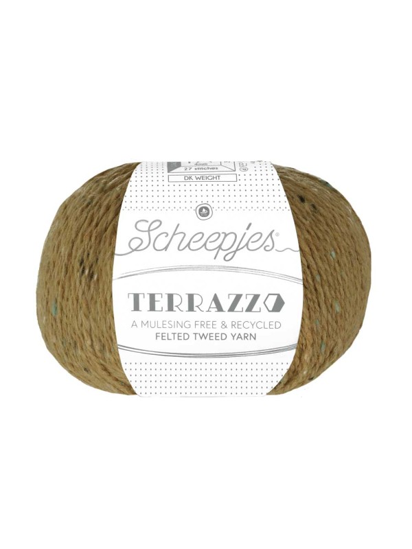 Scheepjes Terrazzo is een volledig gerecyclede wol-viscosemix met een luxe uitstraling en een subtiel gespikkeld kleureffect, dat doet denken aan terrazzo (granito) vloeren. Het gespikkelde effect wordt bewerkstelligd door de vezelpropjes in contrasterende en complementerende kleuren die in deze tweedwol zijn mee getwijnd. Scheepjes Terrazzo profiteert van de ademende kwaliteiten van zowel wol als viscose en combineert daarnaast het beste van die twee: dankzij de viscose voelt het garen zijdezacht aan, is het vocht absorberend, valt het mooi, heeft het een rustieke uitstraling en is het licht van gewicht, terwijl de wol het heerlijk warm maakt. Die combinatie maakt Terrazzo geschikt voor de meest uiteenlopende haak- en breiwerken: van kleding, zoals truien en vesten, tot mode- en woonaccessoires in allerlei vormen en maten. Het leent zich ook prima voor inbreiwerk en haken met meerdere kleuren en is bovendien heel mooi te combineren met Scheepjesgarens in andere texturen, zoals Alpaca Rhythm en Mohair Rhythm. Scheepjes Terrazzo is een Premium Blend tweedwol gemaakt van 70% gerecyclede wol en 30% gerecyclede viscose en is wasbaar tot 30 ᵒC. De geadviseerde naalddikte is 4.00mm (stekenverhouding: 27 steken x 35 naalden tricotsteek is 10 x 10cm). Verkrijgbaar in 60 kleuren, in bollen van 50 gram (looplengte 175 meter)