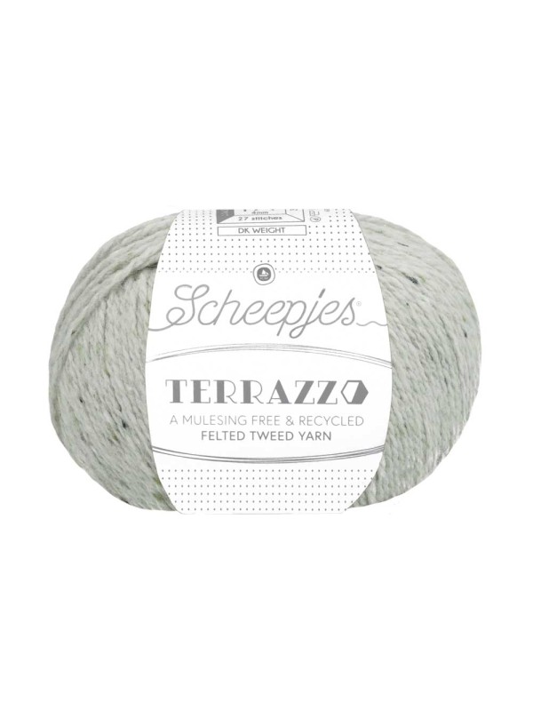 Scheepjes Terrazzo is een volledig gerecyclede wol-viscosemix met een luxe uitstraling en een subtiel gespikkeld kleureffect, dat doet denken aan terrazzo (granito) vloeren. Het gespikkelde effect wordt bewerkstelligd door de vezelpropjes in contrasterende en complementerende kleuren die in deze tweedwol zijn mee getwijnd. Scheepjes Terrazzo profiteert van de ademende kwaliteiten van zowel wol als viscose en combineert daarnaast het beste van die twee: dankzij de viscose voelt het garen zijdezacht aan, is het vocht absorberend, valt het mooi, heeft het een rustieke uitstraling en is het licht van gewicht, terwijl de wol het heerlijk warm maakt. Die combinatie maakt Terrazzo geschikt voor de meest uiteenlopende haak- en breiwerken: van kleding, zoals truien en vesten, tot mode- en woonaccessoires in allerlei vormen en maten. Het leent zich ook prima voor inbreiwerk en haken met meerdere kleuren en is bovendien heel mooi te combineren met Scheepjesgarens in andere texturen, zoals Alpaca Rhythm en Mohair Rhythm. Scheepjes Terrazzo is een Premium Blend tweedwol gemaakt van 70% gerecyclede wol en 30% gerecyclede viscose en is wasbaar tot 30 ᵒC. De geadviseerde naalddikte is 4.00mm (stekenverhouding: 27 steken x 35 naalden tricotsteek is 10 x 10cm). Verkrijgbaar in 60 kleuren, in bollen van 50 gram (looplengte 175 meter)
